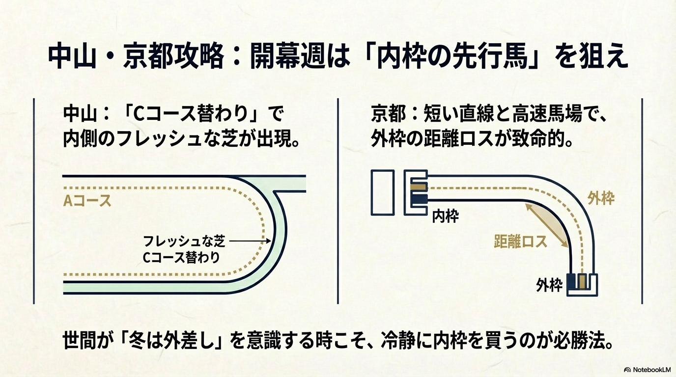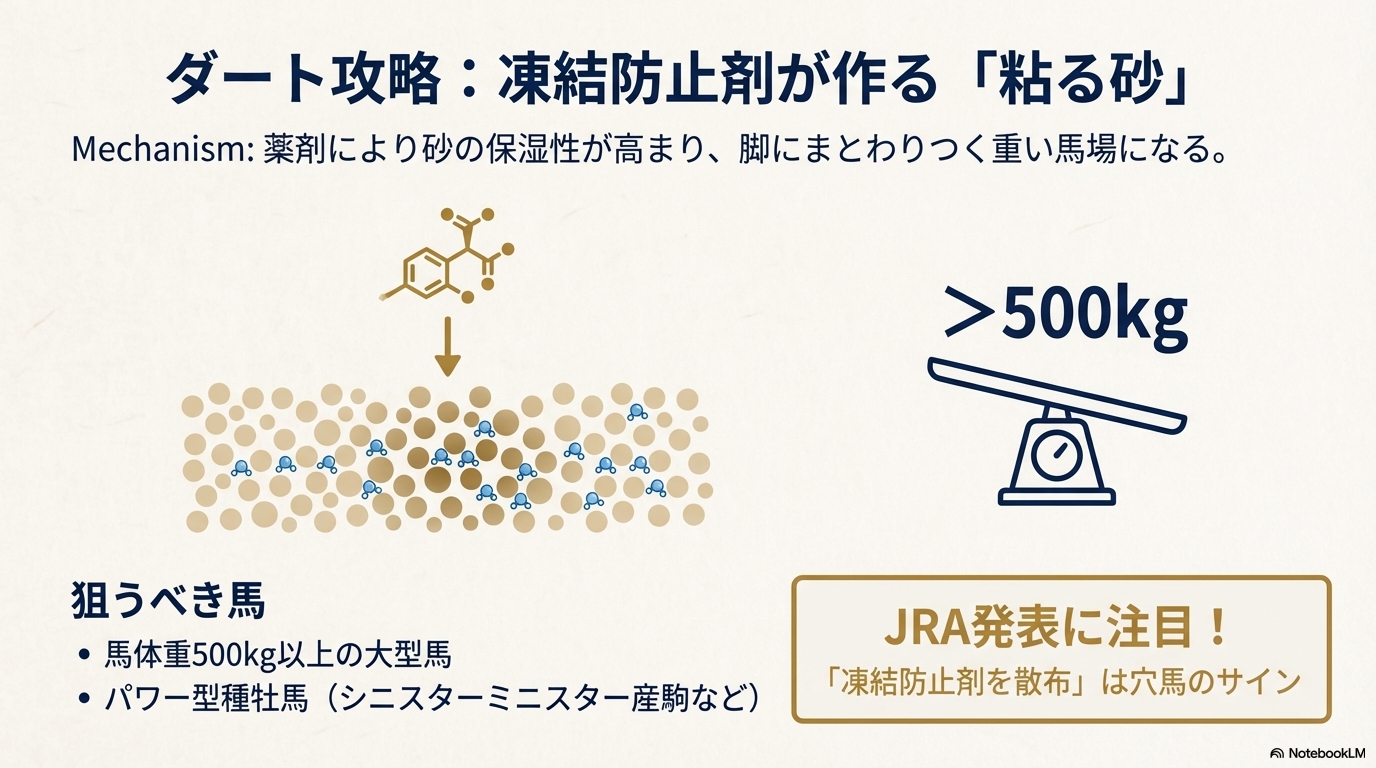 - 冬特有の「重い芝」と「凍結防止剤入りダート」のメカニズムを完全攻略
