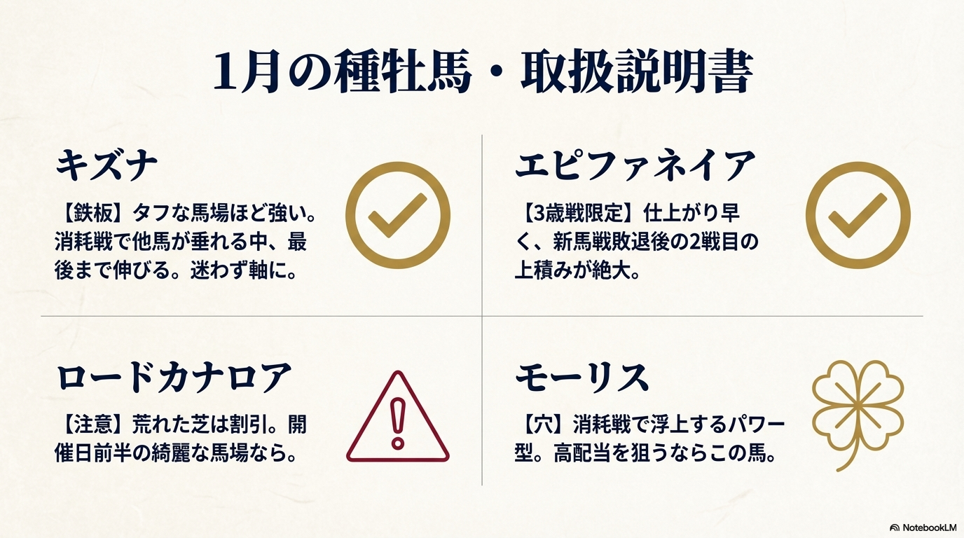 芝コースなら欧州血統や洋芝実績のある馬。ダートコースなら「凍結防止剤」の有無を確認し、撒かれていればパワー型を優先する。持ち時計の速さは、冬のタフな馬場では何の保証にもなりません。 - 【血統】「キズナ」を信じ、「モーリス」で夢を見る