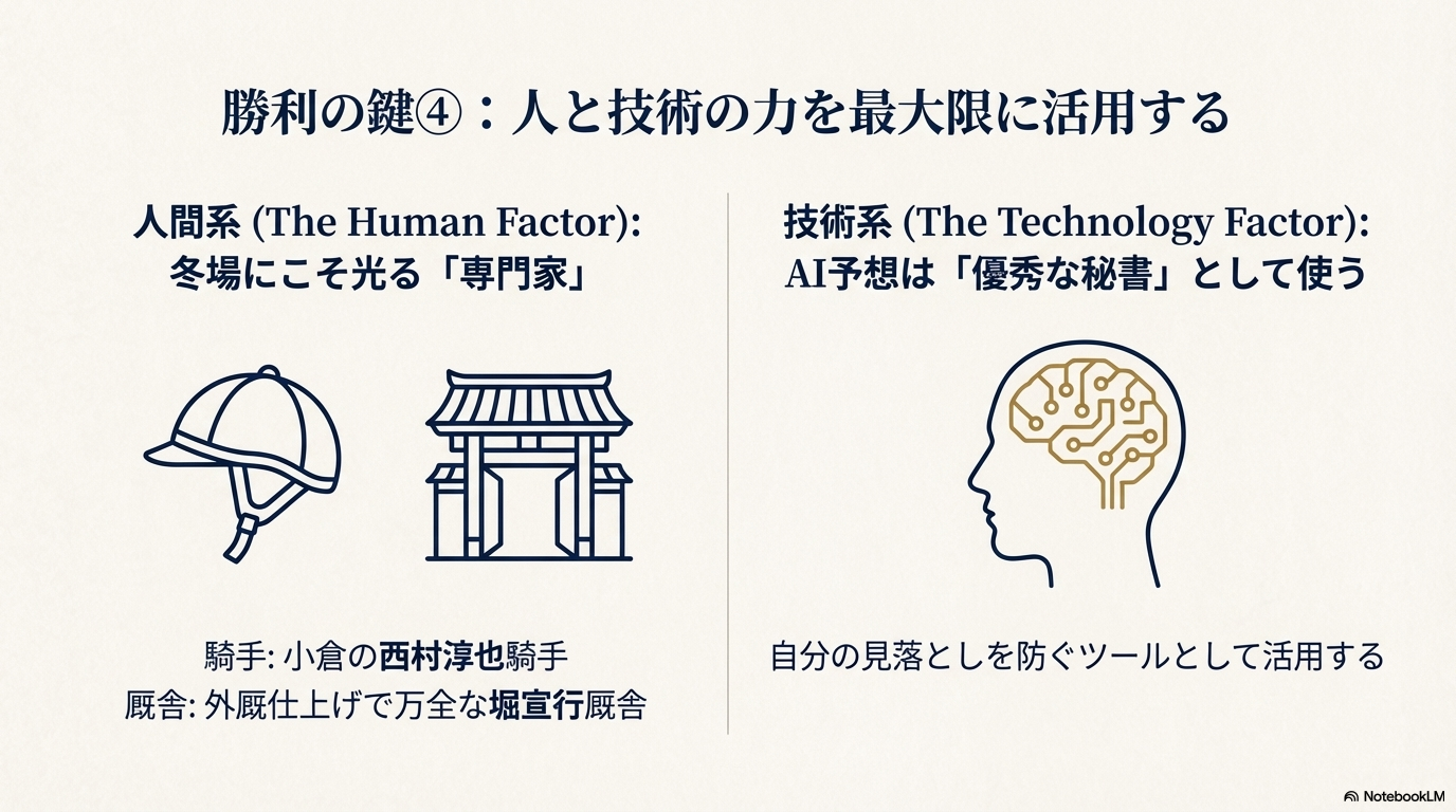 凍結防止剤入りのネチャネチャしたダートや、乾燥して深いダートをこなすには物理的な質量が必要です。迷ったら、馬体重500kg以上の大型馬を選んでください。 - 【ツール】AIは「優秀な秘書」、決断は「社長(あなた)」