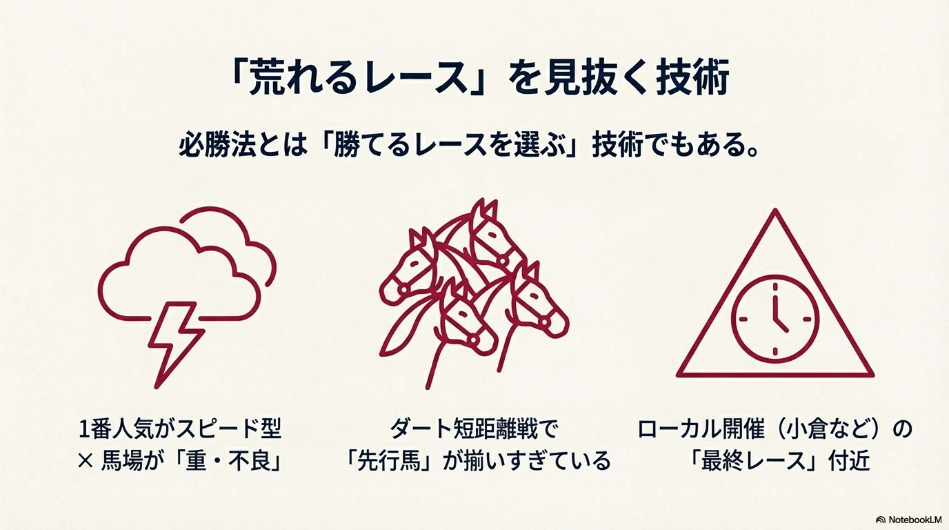 「必勝法」と聞くと、多くの人は「全てのレースで的中させる魔法」を想像しがちです。しかし、真の勝ち組にとっての必勝法とは、「勝てる確率が高いレースを選び、リスクの高い(荒れそうな)レースを徹底的に見送る(ケンする)」という選択の技術に他なりません。特に1月の未勝利戦は、人気馬が脆く崩れ去る「地雷」が埋まっているレースが多々あります。
