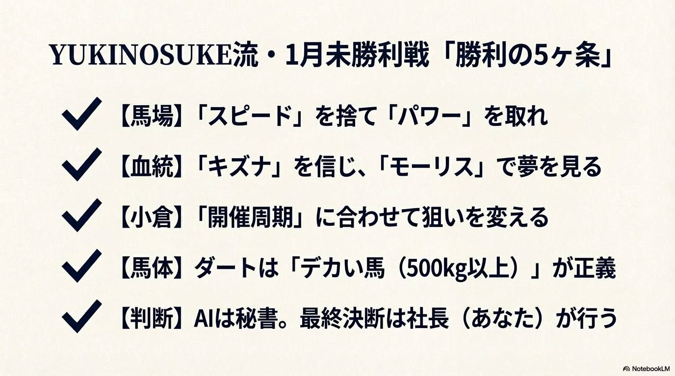 ここまで、非常に多くのデータや戦略を解説してきましたが、最後までお付き合いいただきありがとうございます。記事全体を通して私、YUKINOSUKEが最も伝えたかったことは、「1月の競馬は、運ではなく『環境への適応力』で勝負が決まる」という真実です。
