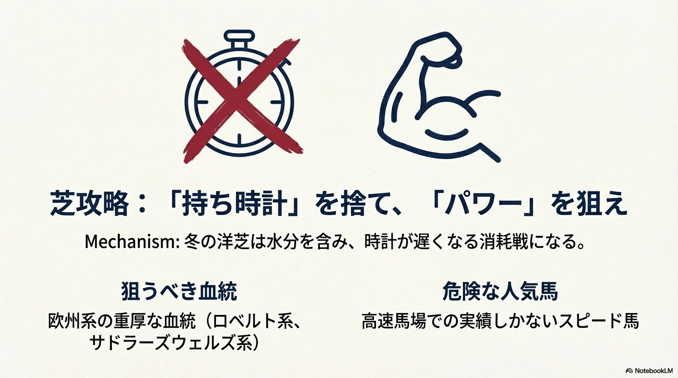 - 冬特有の「重い芝」と「凍結防止剤入りダート」のメカニズムを完全攻略
