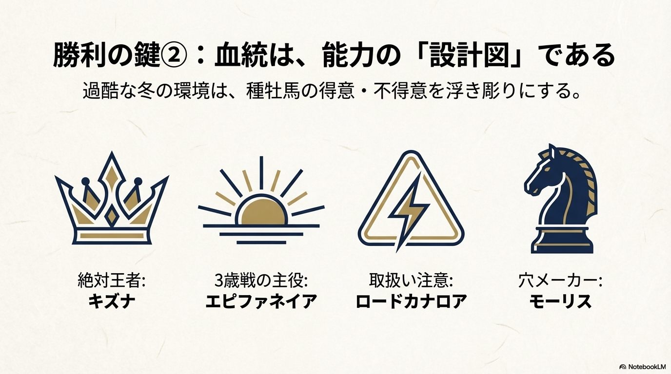 芝コースなら欧州血統や洋芝実績のある馬。ダートコースなら「凍結防止剤」の有無を確認し、撒かれていればパワー型を優先する。持ち時計の速さは、冬のタフな馬場では何の保証にもなりません。 - 【血統】「キズナ」を信じ、「モーリス」で夢を見る