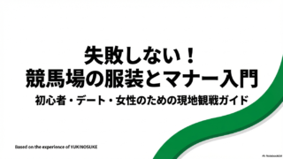 競馬場への服装やマナーについて悩む初心者や女性、カップルに向けて、現地で失敗しないためのポイントを解説します 。広大な場内を1万歩以上歩くための靴選びや 、競馬場の服装やマナーの基本である馬への配慮などを網羅 。この記事を読めば、当日は心置きなくレースを楽しめます。