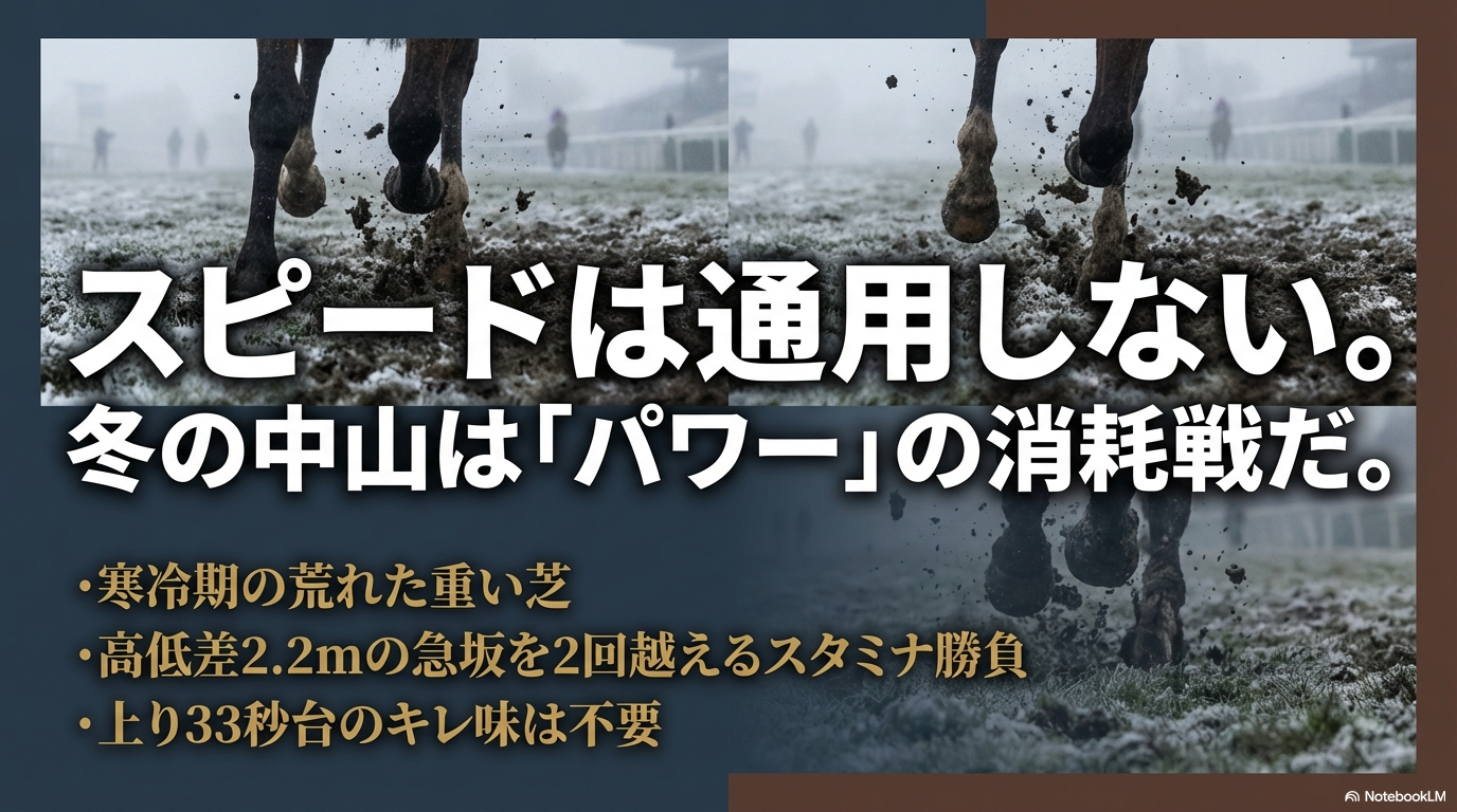 さらに決定的なのが「季節」です。1月下旬の厳寒期、中山の野芝は完全に休眠し、オーバーシードされた洋芝も開催後半でボコボコに傷んでいます。クッション値は低く、地面が緩い。つまり、私たちが普段イメージする「パンパンの良馬場」で行われるスピード勝負とは、全く別競技のような「パワーとスタミナの消耗戦」になりやすいのです。