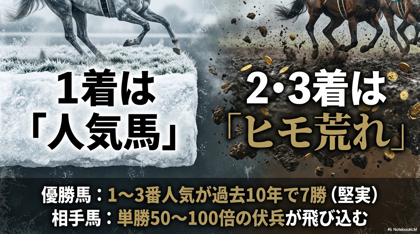 勝ち馬(1着)に関しては、過去10年で1番人気〜3番人気の上位勢が7勝を挙げており、比較的安定しています。しかし、2着・3着の座席には、単勝オッズ50倍〜100倍クラスの「伏兵」が頻繁に飛び込んでくるのです。