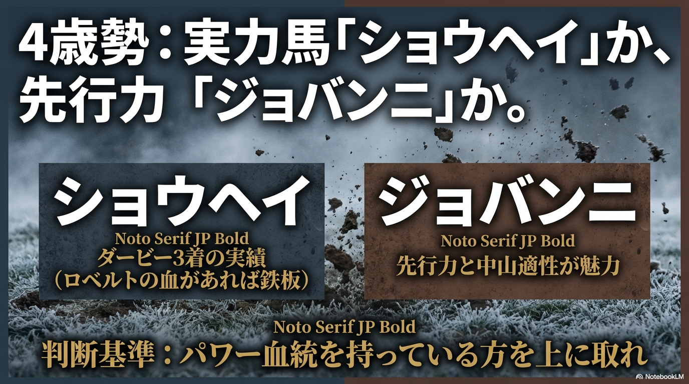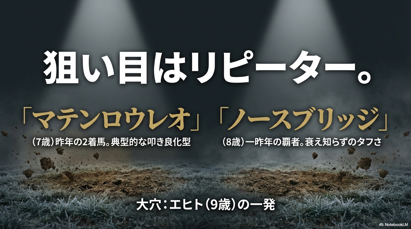 • 精神的なタフさ:寒さやタフな馬場に動じない精神力は、数々の激戦をくぐり抜けてきたベテラン馬の方に分があります。
