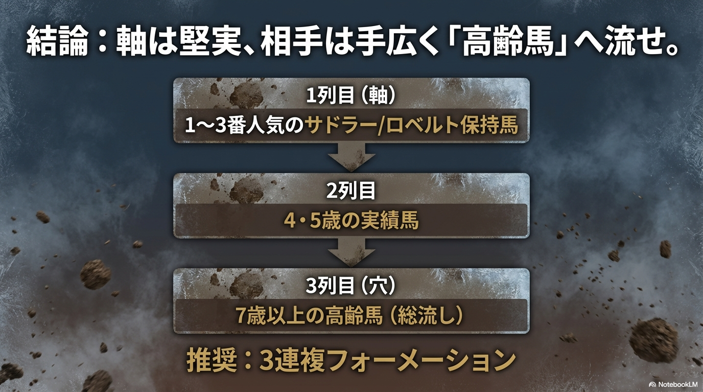 結論として、「迷ったら高齢馬」。これがAJCCの裏ワザであり、周りのファンがフレッシュな4歳馬に飛びついている間に、私たちがこっそりと利益を得るための最短ルートなのです。