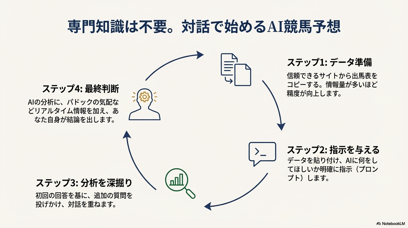 ChatGPTを使って競馬予想を始めることは、決して難しい作業ではありません。高度なプログラミングの知識や専門的なソフトウェアは一切不要で、いくつかの簡単なステップを踏むだけで、誰でもAIによる高度な分析の恩恵を受けることができます。ここでは、初心者の方でも迷わず、そしてより効果的にAIを活用できるよう、具体的なやり方を4つのステップに分けて丁寧に解説していきます。