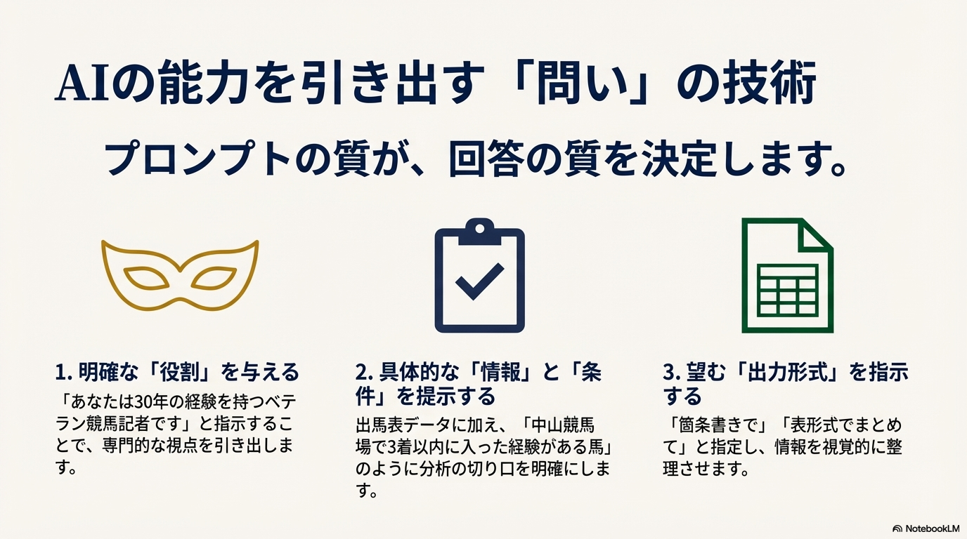 ChatGPTの能力を最大限に引き出すためには、いわばAIの思考の”設計図”となる指示文、すなわち「プロンプト」の質が極めて重要です。漠然とした質問では、AIも当たり障りのない一般的な回答しか返せません。逆に言えば、プロンプトを少し工夫するだけで、AIは驚くほど専門的で的確な分析結果を提供してくれます。ここでは、あなたの競馬予想の精度を飛躍的に高めるための、効果的なプロンプト作成のコツを、初心者でも実践できる3つの重要なポイントに絞って、より深く解説します。