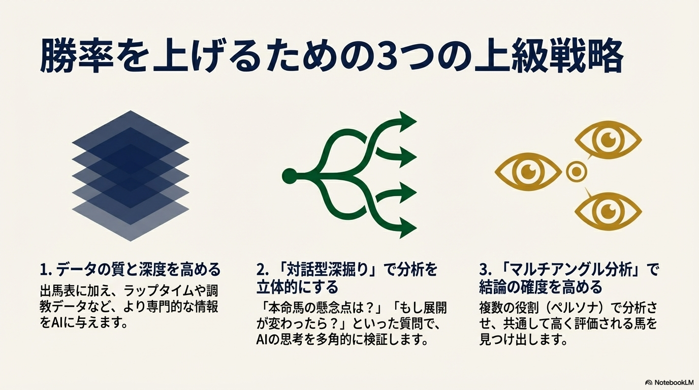 これらの要素は、AIの分析を補完する最後のピースです。AIを「非常に優秀なデータ分析官」、そしてあなた自身を「最終的な意思決定を下す監督」と位置づけ、両者の強みを活かすことで、競馬予想の精度は最大化されるでしょう。