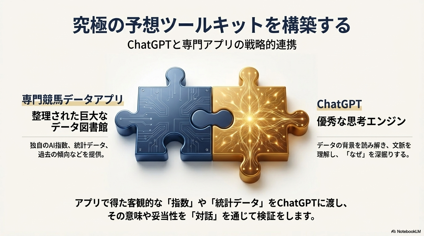 このような対話を通じて、アプリが算出した数値的分析(定量的)の背景を、ChatGPTが持つ文脈的分析(定性的)の力で解き明かすことができます。これにより、「指数は高いが、今回は苦手な条件が揃っているから危険かもしれない」といった、より深いレベルの結論を導き出すことが可能になるのです。