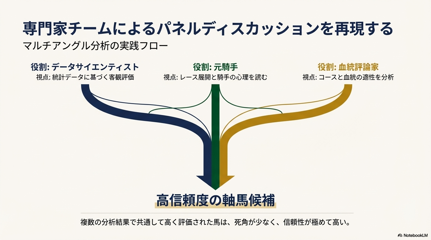 例えば、同じレースを分析させる場合でも、与える役割によってアウトプットの切り口は全く異なります。