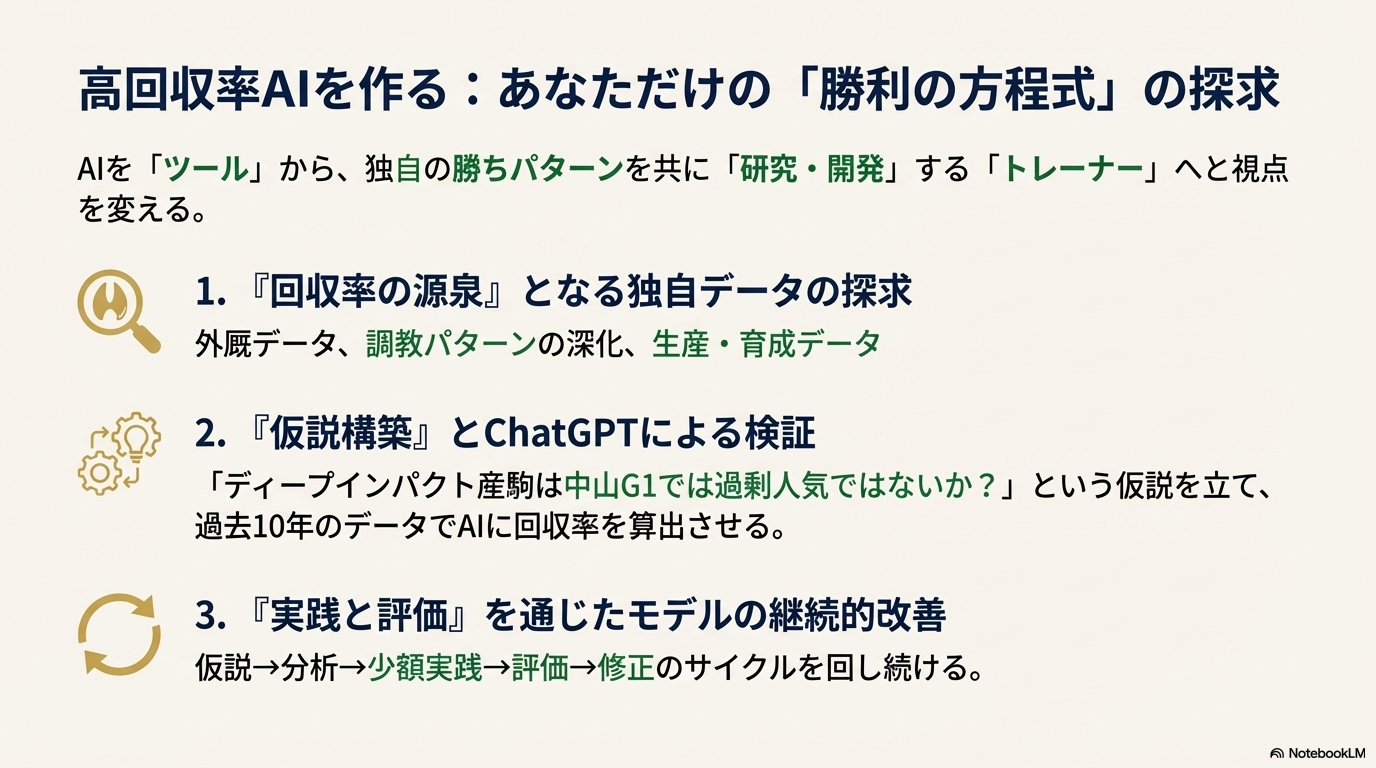 - 高回収率のオリジナルAIを作るには、独自の仮説を立てて検証するサイクルを回すことが鍵