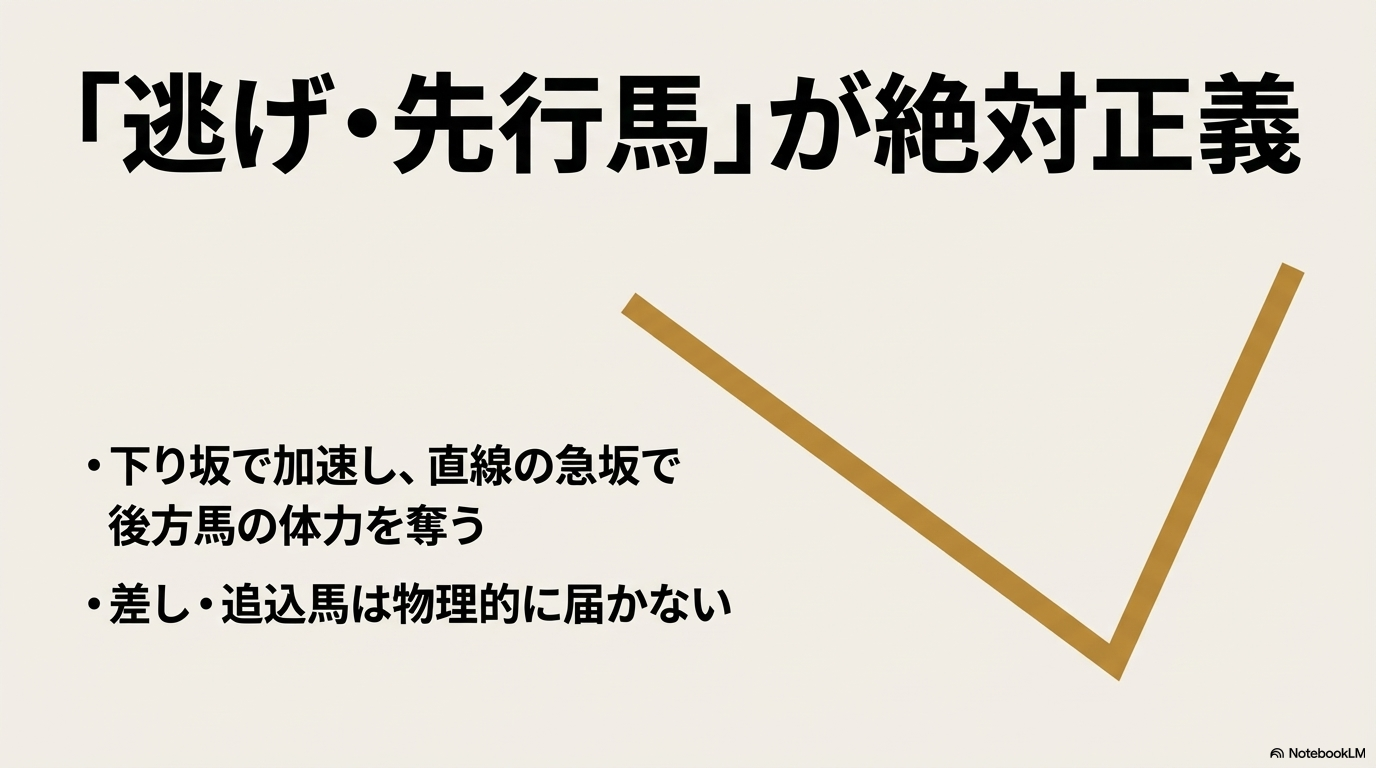 - 3〜4コーナーの下り坂が、先行馬の余力を残す「加速装置」になる