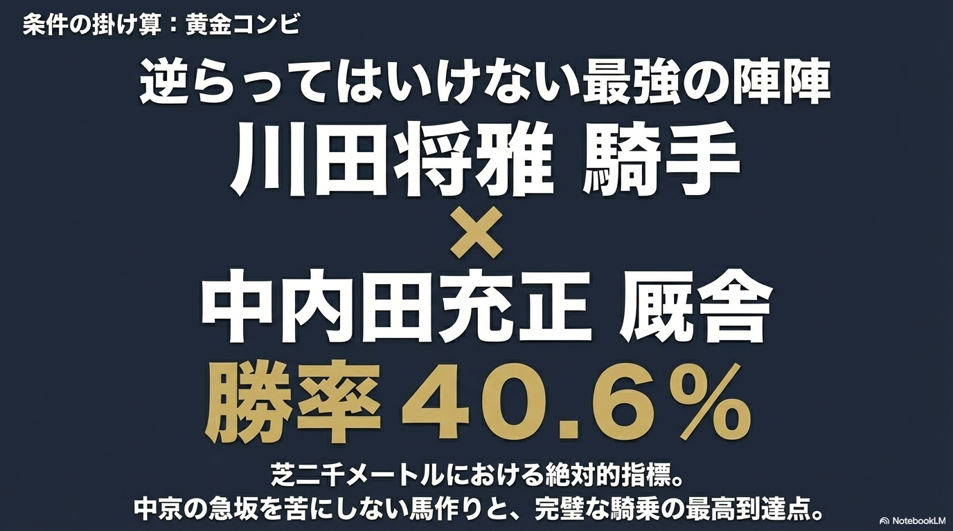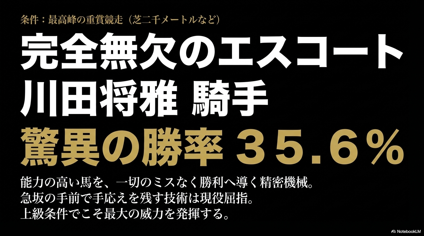 もちろん、川田将雅騎手もこのコースを得意としています。勝率35.7パーセント、複勝率57.1パーセントという数字は、単なるコース相性を超えた、馬の能力を100パーセント引き出す川田騎手ならではの凄みですよね。ただし、川田騎手は人気馬に騎乗することが多いため、どうしても回収率は幸騎手に一歩譲ります。私がお勧めする使い分けは、「的中率を重視する軸馬なら川田騎手、一発逆転の妙味を狙うなら幸騎手」という戦略です。