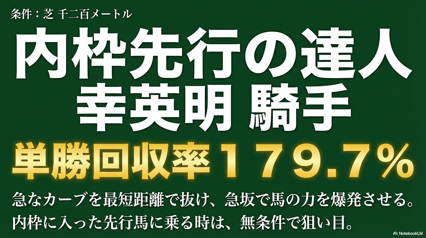 幸騎手の凄さは、中京特有の「内枠・先行」というセオリーを誰よりも深く理解し、かつ実践できる点にあります。中京芝1200メートルは、スパイラルカーブの影響で外に膨らみやすいため、最短距離を通れる内枠の先行馬が圧倒的に有利になります。幸騎手は、スタート直後の上り坂で無理をせず、下り坂を利用してスムーズにポジションを上げ、直線入り口の急坂で馬が最も力を出せるタイミングを計るのが本当に上手いんです。この技術が、単勝回収率179.7パーセントという、ベタ買いしても利益が出る驚きの数字を支えているかなと思います。