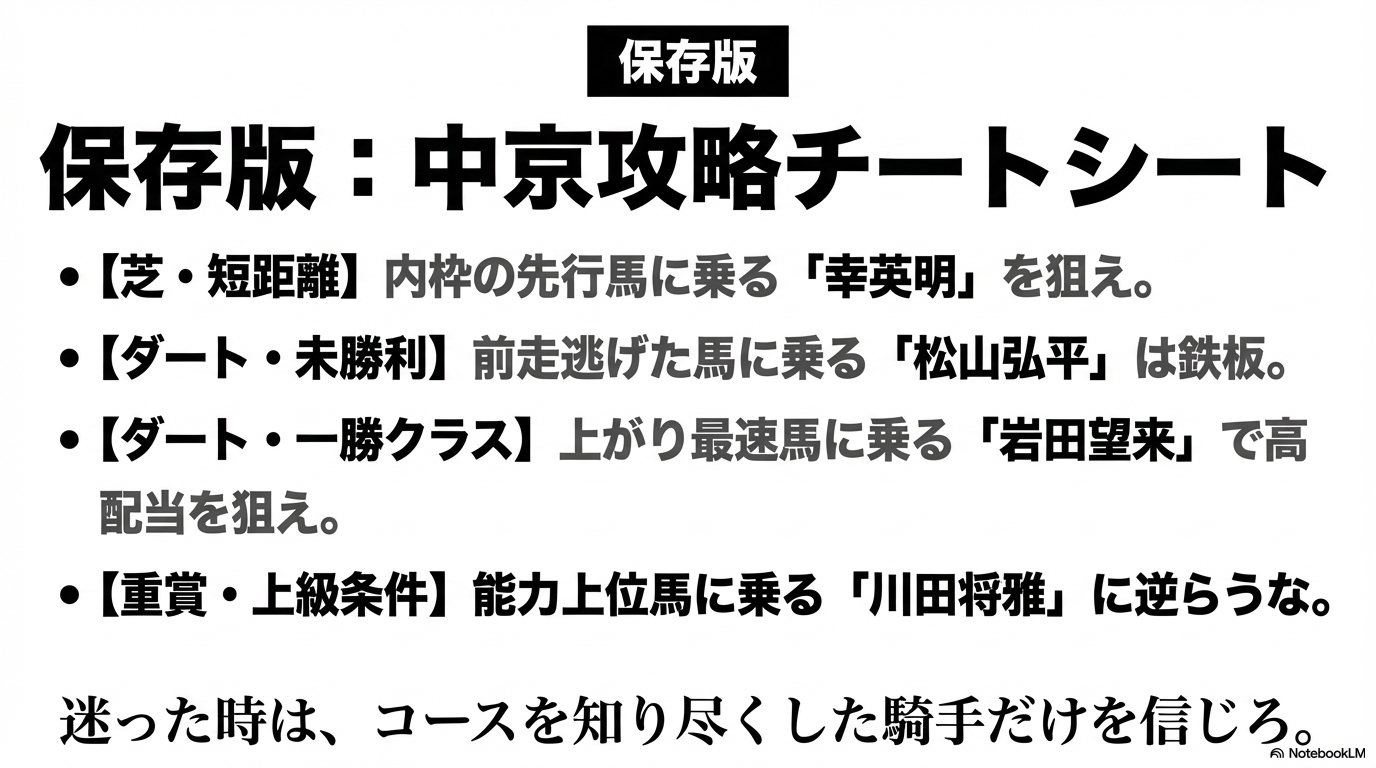 このように、中京競馬場の得意な騎手を分析する際は、単純なリーディング順位だけでなく「どの戦場(クラス)での専門家か」を見極めることが不可欠です。未勝利戦は「前に行く意志」の強い松山騎手、1勝クラスは「ペース判断」の岩田望来騎手、重賞や上級条件は「完璧なエスコート」の川田騎手。この黄金の使い分けルールを徹底するだけで、無駄な不的中を減らし、期待値の高い馬券だけを狙い撃つことができるようになります。