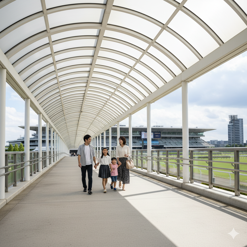 公共交通機関を利用する場合、最も便利なのは名鉄名古屋本線の「中京競馬場前」駅です。名古屋駅からは急行や準急を利用して約20~30分程度で到着します(特急は停車しないためご注意ください)。駅の改札を出ると、競馬場の西入場門まで「ペガサスブリッジ」という屋根付きの専用連絡通路で直結しており、雨の日でも濡れずに徒歩約10分程度でアクセス可能です。(参照:JRA公式サイト 中京競馬場アクセス)