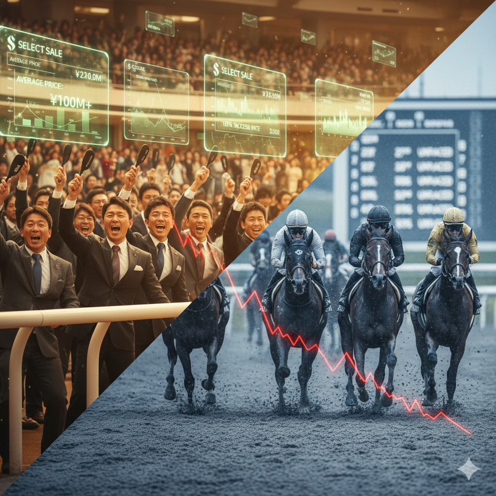 あれほど堅調だったセレクトセールの市場評価(平均1億超え、落札率100%) も、ついに「期待が実態を上回りすぎていた」として調整局面に突入する可能性が高いです。具体的には、平均価格の急落や、買い手がつかない「主取(しゅとり)」の増加 といった形です。