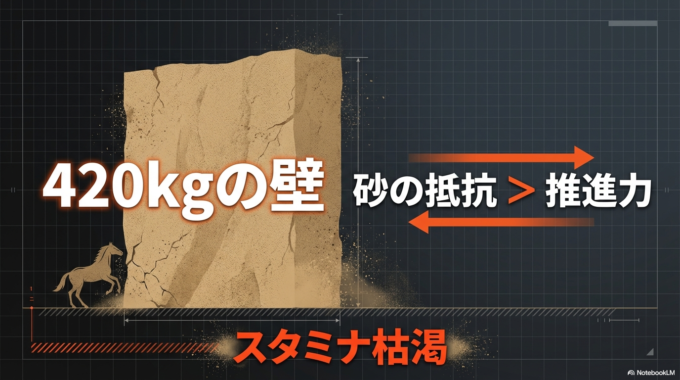 440kg以下 砂の表面で滑りやすい 抵抗を相殺できずスタミナを早期消耗