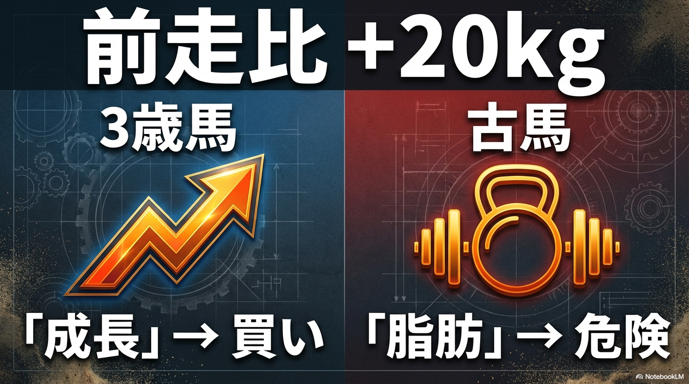 • 3歳馬の+20kg: 成長期の増量は「覚醒」のサイン。パドックで張りが確認できれば迷わず買い