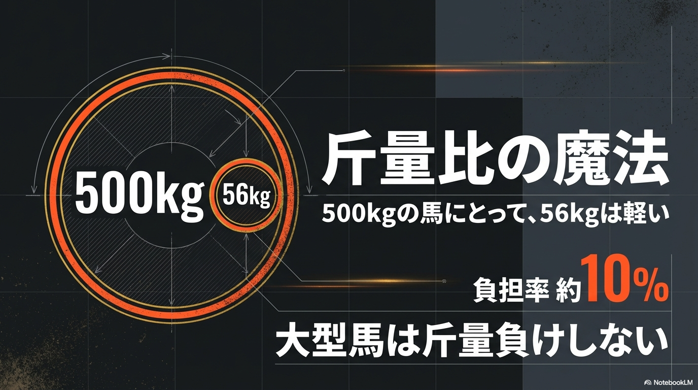 • 斤量比の罠: 大型馬ほど斤量の影響が小さく、減量騎手起用の恩恵を最大限に享受できる
