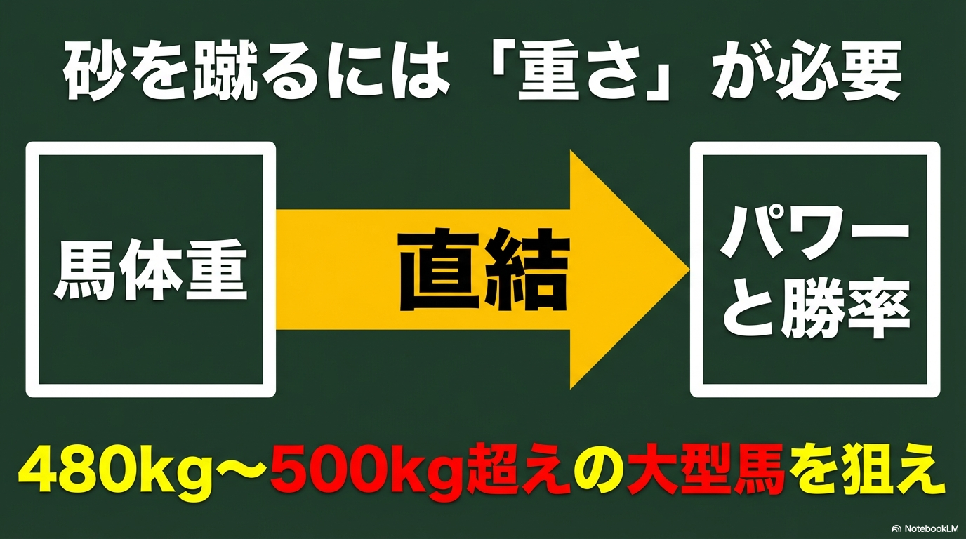 ダート馬選びの基本:馬体重が重い馬ほど、砂を蹴る力が強く、勝率・回収率ともに高くなる傾向があります。480kg〜500kg超えの大型馬は、ランキング上位種牡馬の特性を最も活かしやすいサイズ感として常に注視しておきたいですね。