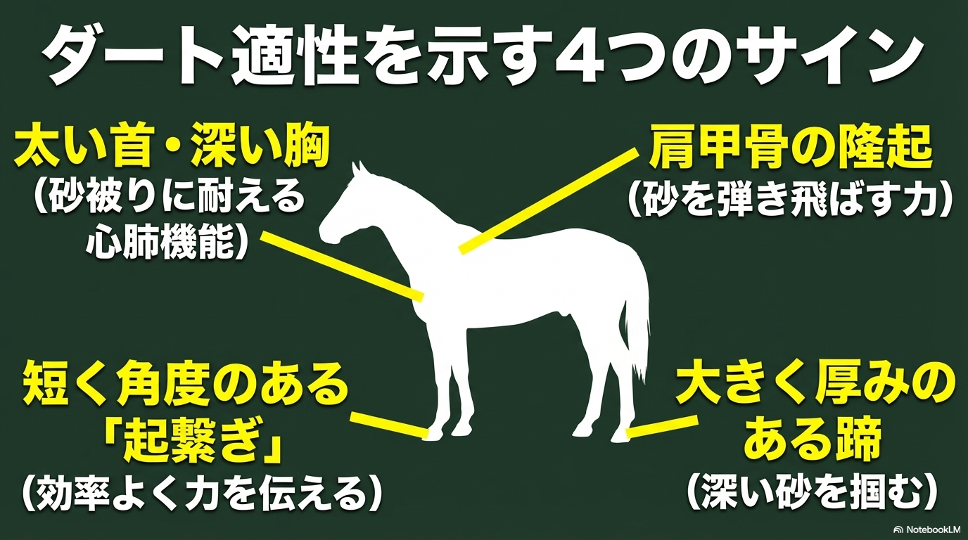 馬体の細かいパーツに目を向けると、さらに興味深い事実が見えてきます。よく「繋ぎが立っている(地面に対して垂直に近い)馬はダート向き」と言われますが、これもコースの砂質によって柔軟に解釈を変えるべきです。砂が深い地方競馬場や冬の中山ダートなどでは、確かに「起繋(おきつな)」の方が砂に脚が埋まりにくく有利ですが、東京や京都のような脚抜きの良いスピードダートでは、むしろ「適度に寝た繋ぎ」を持つ馬の方が、ストライドを伸ばして時計に対応できることがあります。
