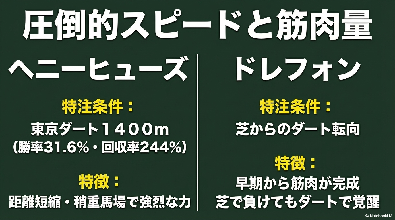 中央ダートの王者ヘニーヒューズは、母系に日本独自のサンデーサイレンス系(特に特定のタイプ)を配することで、その破壊的なスピードをコントロール可能な形へと昇華させています 。
