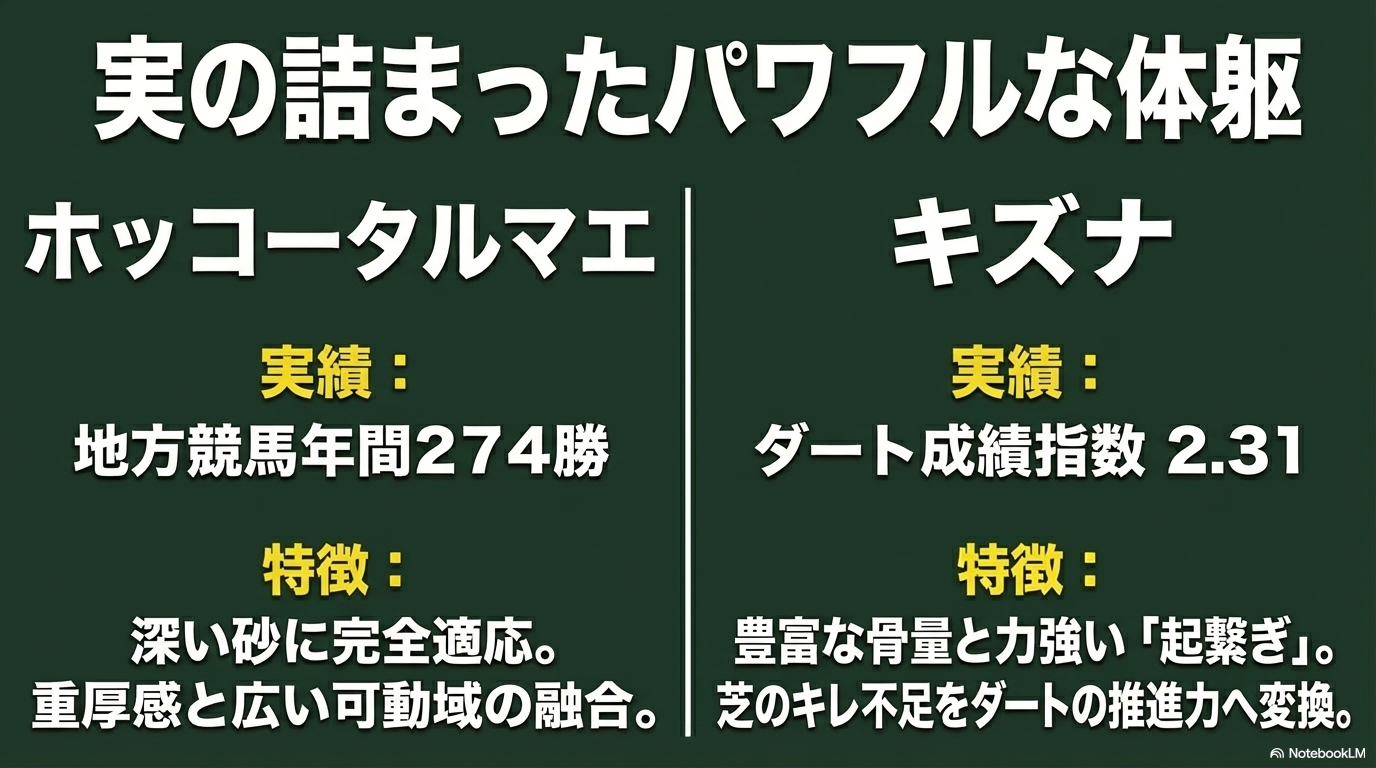 ホッコータルマエ産駒の中には、父譲りの重厚感を持ちつつも、繋ぎ(つなぎ)の可動域が広く、軽いフットワークで走れるタイプがいます。こうした馬は、急坂を駆け上がる際にかかる負担を上手く逃がすことができるため、他馬がバテる坂の上で「もう一伸び」が可能になります。数字の上では「パワー型」と思われがちですが、コースの物理的構造(高低差)と「見た目の軽さ」が合致した瞬間に、単勝万馬券級の激走が生まれるわけですね。