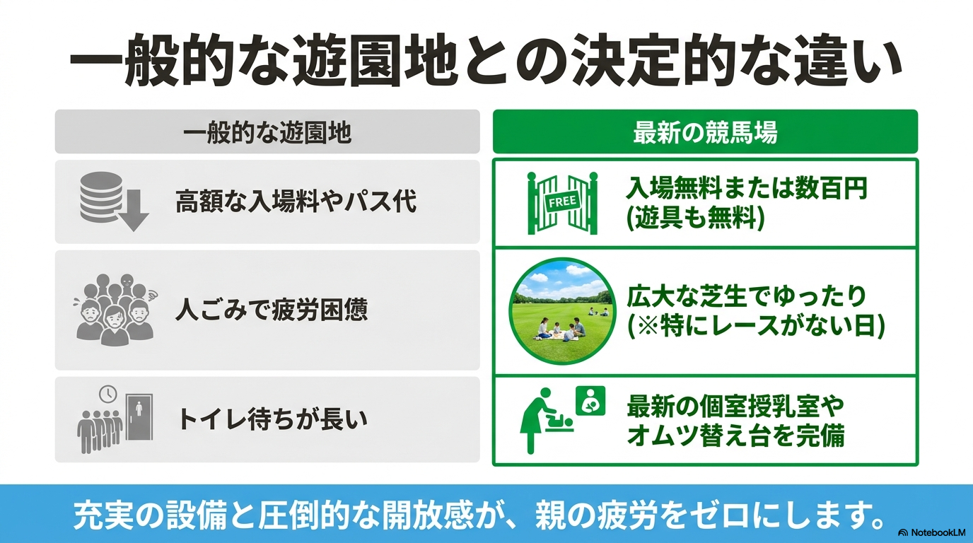 最近の競馬場が、実は家族連れにとって最高のレジャースポットに進化していることをご存知でしょうか。かつてのイメージとは異なり、今の競馬場は広大な緑地、最新の遊具、そして清潔な施設が揃った「巨大な公園」そのものです。私自身、最初は子供を連れて行くことに少し抵抗があったのですが、実際に行ってみるとその利便性と楽しさに驚かされました。