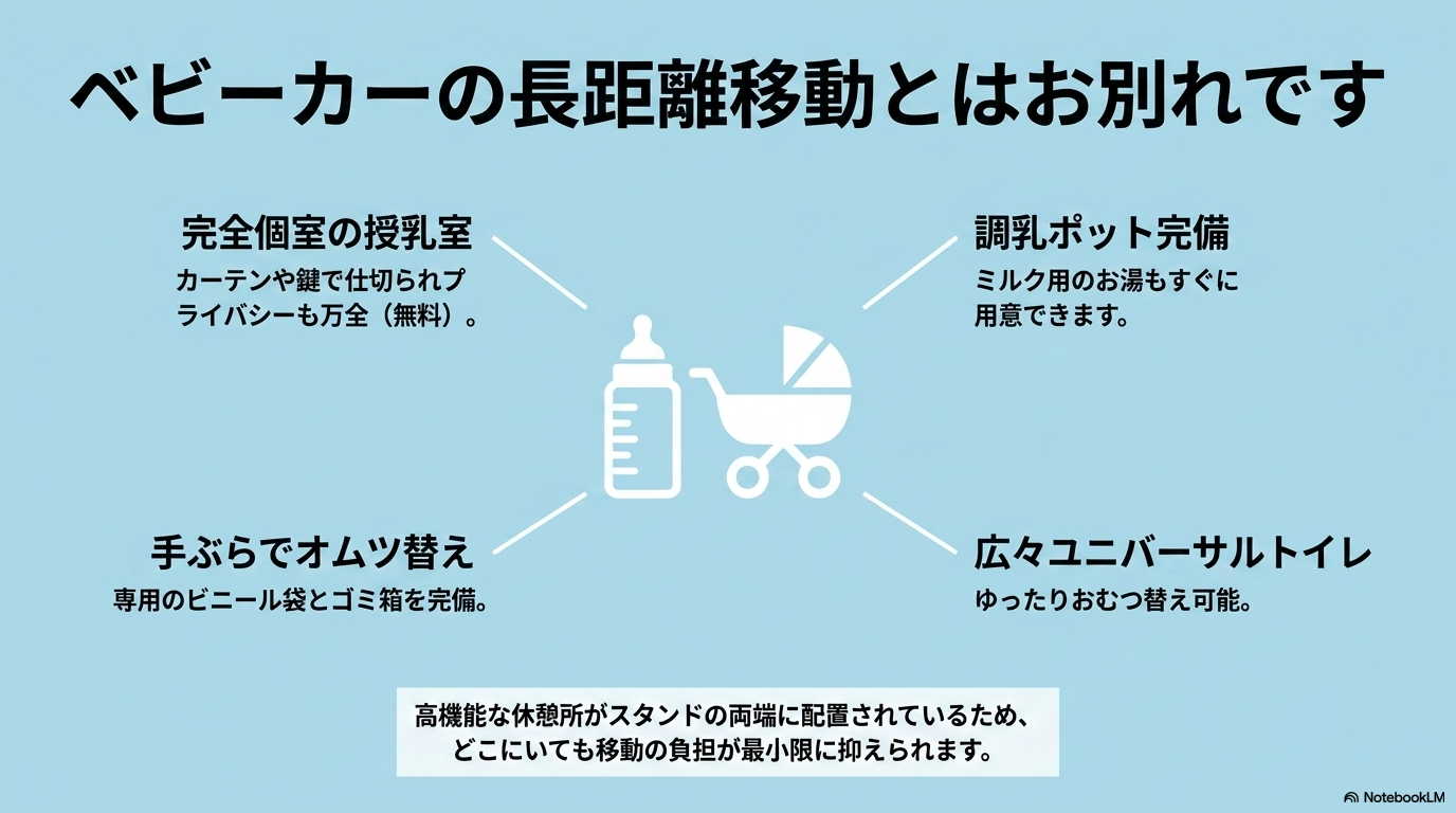 ペガサススタンド「チャイルドコーナー」と充実の育児設備