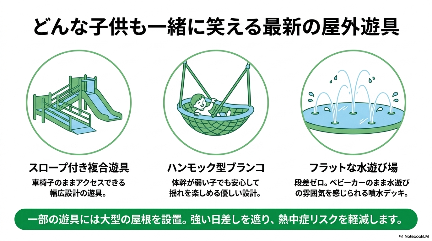 また、人感センサーで水が飛び出すウッドデッキ型の「ファウンテンデッキ」は、段差が一切ないフラットな構造になっており、ベビーカーのまま水遊びの雰囲気を感じることもできます。 こうした先進的な取り組みは、多様な子供たちが同じ場所で笑い合える環境づくりとして、非常に高く評価されています(出典:国土交通省『都市公園におけるインクルーシブな遊具広場整備ガイドライン』)。さらに、一部の遊具エリアには大型の屋根(膜屋根)が設置されているため、強い日差しから子供を守り、熱中症リスクを軽減させている点も、親としては誠実さを感じるポイントですね。