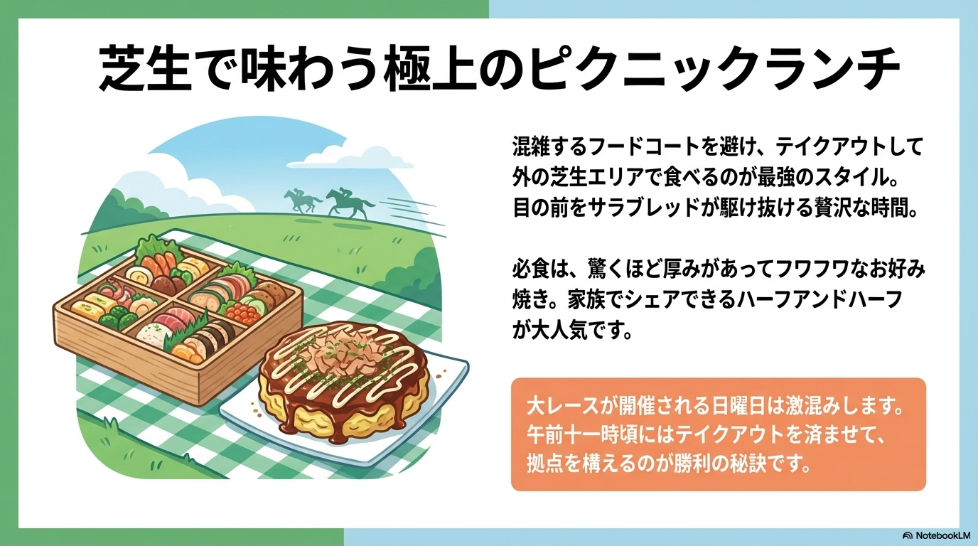 私が家族で訪れる際にいつも感じるのは、阪神競馬場特有の「開放感」です。スタンド内にはフードコートもありますが、元気な盛りのお子さんがいるなら、断然テイクアウトして外の芝生エリアで食べる「ピクニック・スタイル」を強くおすすめします。お腹を満たしながら、目の前を走り抜けるサラブレッドの迫力を感じられるのは、他のレジャー施設では絶対に味わえない贅沢なランチタイムかなと思います。