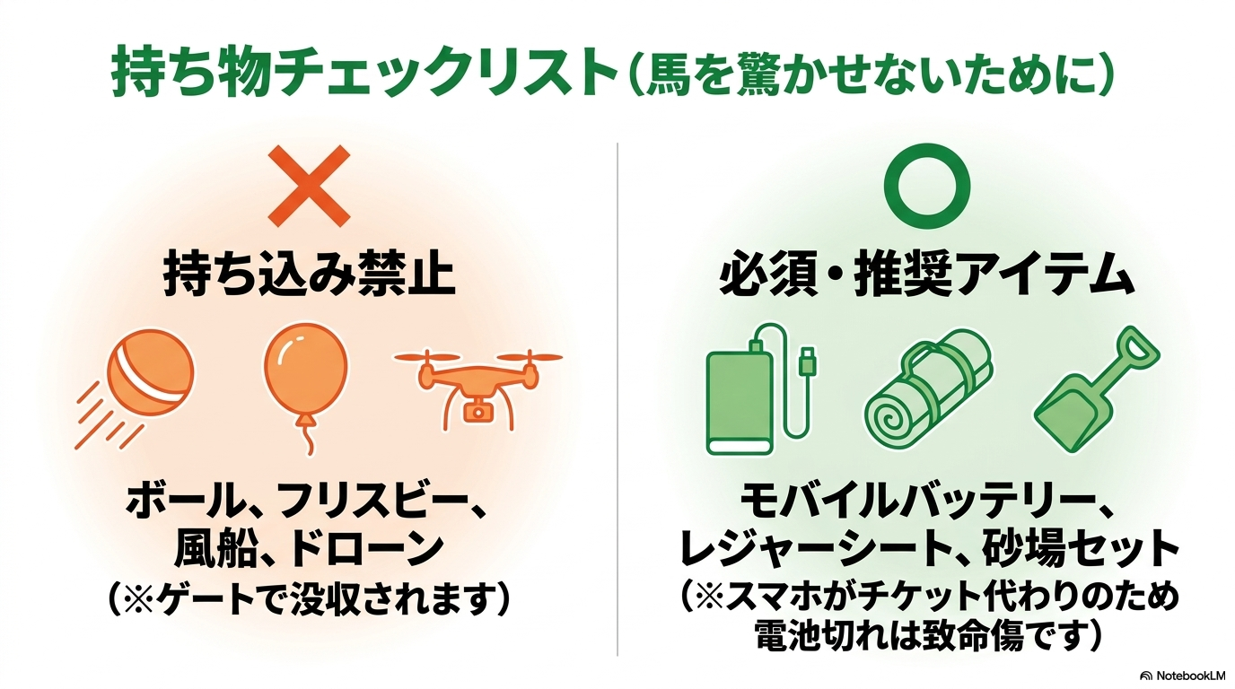 - 騒音が出るもの:ホイッスル、拡声器、楽器、大音量のスピーカーなど。場内放送の妨げや、馬を驚かせる原因になります。