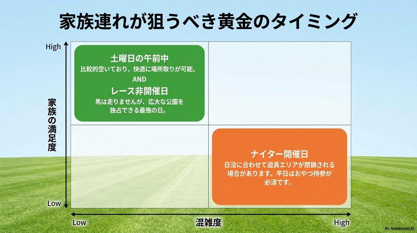 「競馬場へ行こう!」と思い立ったとき、一番悩むのがタイミングですよね。特に小さなお子さんがいる場合、人混みで疲れてしまったり、遊具が混みすぎて遊べなかったりするのは避けたいところ。私が実体験から導き出した、競馬場に家族連れで訪れるための「黄金のタイミング」は、ズバリ「土曜日の午前中」、そして意外な穴場である「パークウインズ(場外発売日)」です。