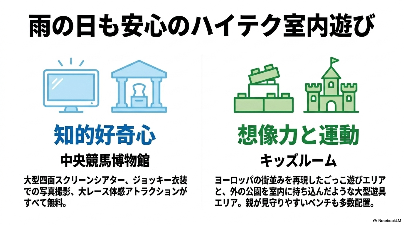 びしょ濡れになること必至なので、着替えとタオルを持っていくのが私からのアドバイスです。 また、このエリアのすぐ隣には「JRA競馬博物館」が併設されています。ここは入場無料で、雨が降ってきた時の避難先としても優秀ですが、中身は驚くほどハイテクです。大型4面スクリーンで迫力の映像が楽しめる「ライヴシアター」や、ジョッキーになりきって写真を撮れる「なりきりジョッキー」、さらには乗馬マシンに乗ってG1レースを体感できる最新アトラクション「RIDE ON G1 HORSE」など、知的好奇心と遊び心を同時に満たしてくれます。