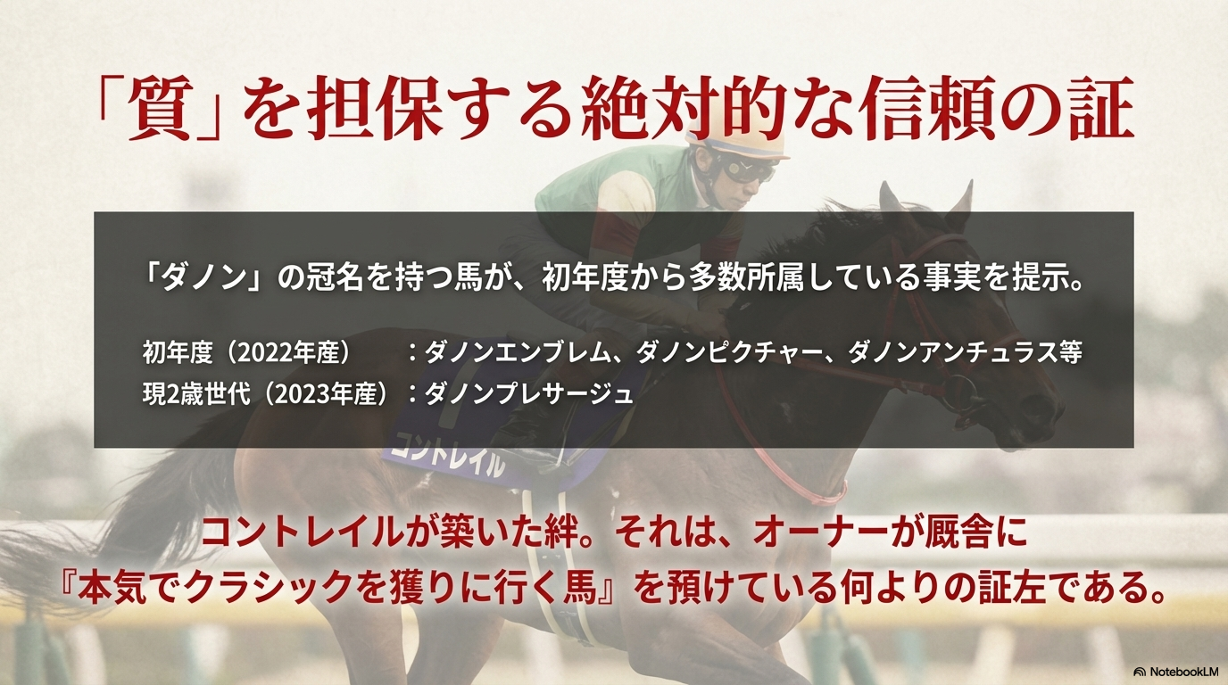 ですが、福永厩舎の魅力はそれだけではありません。そのエースに続く、血統的魅力にあふれたデビュー予定馬 や、厩舎のラインナップがいかに豪華絢爛かを示す「ダノン」 などの有力馬主の馬たちも、1頭ずつピックアップして見ていきましょう。この「すでに結果を出したエース」と「未知の魅力にあふれた良血馬」が両立している点こそが、POG戦略において福永厩舎が最重要ターゲットとなる理由です。開業2年目とは思えない、この充実のラインナップに驚く準備はいいですか?