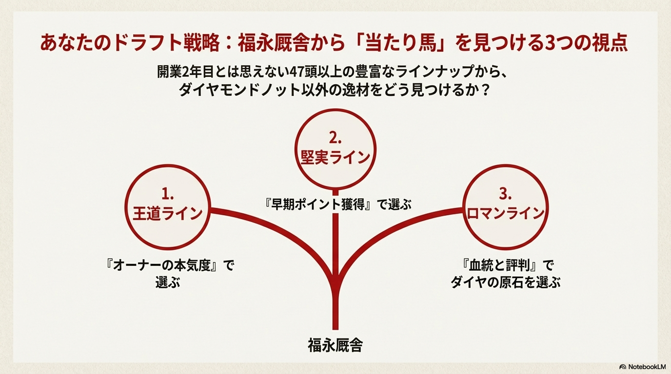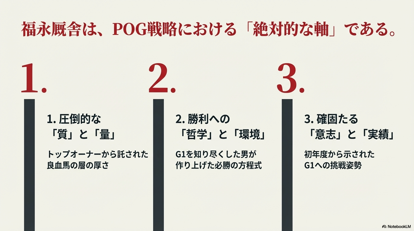 この最終セクションでは、それらの「点」をすべて「線」で結び、POG戦略という観点から「なぜ福永厩舎の馬を指名すべきなのか?」…その核心的な理由を、POGプレイヤーとしての「確信」に変える3つの視点にまとめてみたいと思います。