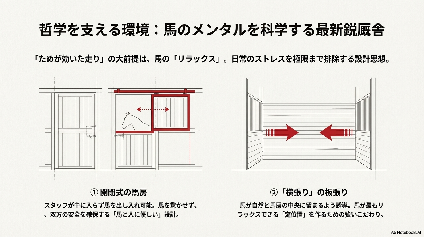 • ハードウェア(設備): 馬のメンタルを安定させ、リラックスを促す特注の「横張り」馬房や「開閉式」の設計 。