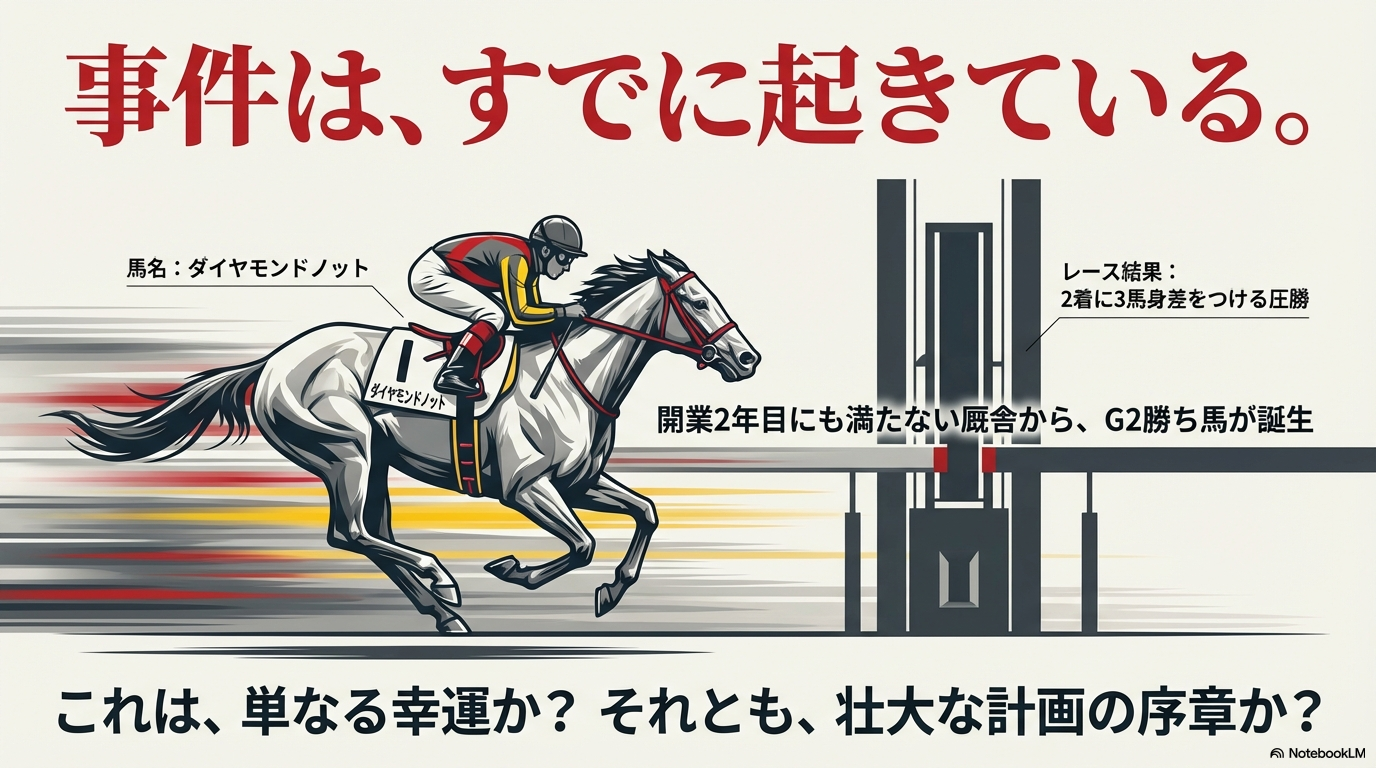 初年度世代の【サラコスティ】が見せた「挑戦」 が、わずか1年後、2年目世代の【ダイヤモンドノット】による「G2勝利」 という形で、早くも「結果」として結実した。私は、これは「偶然」や「幸運」などではなく、「必然」のステップアップだと見ています。