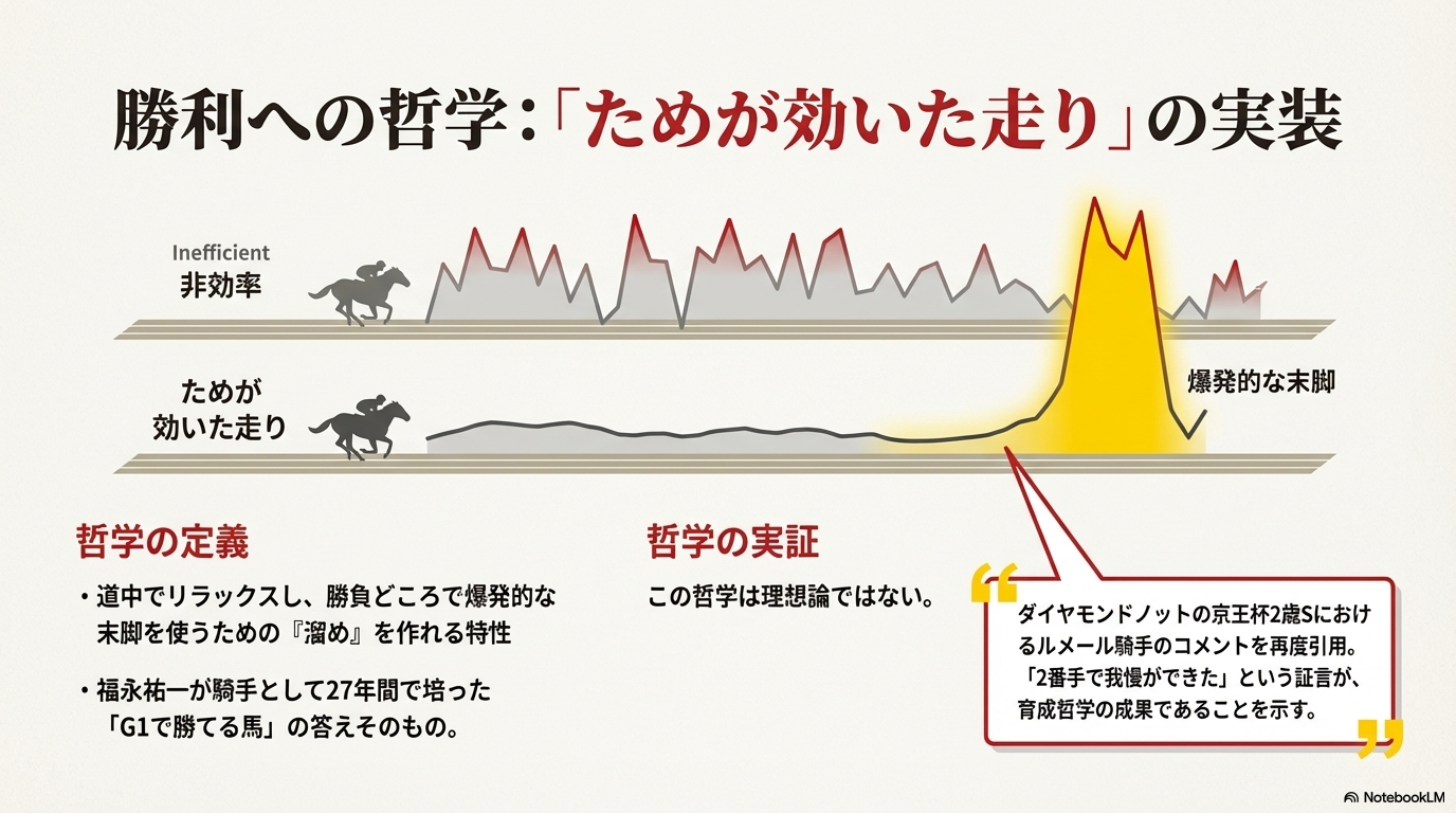• ソフトウェア(哲学): 「ためが効いた走り」 という、騎手・福永祐一の27年間のG1勝利経験の集大成 。