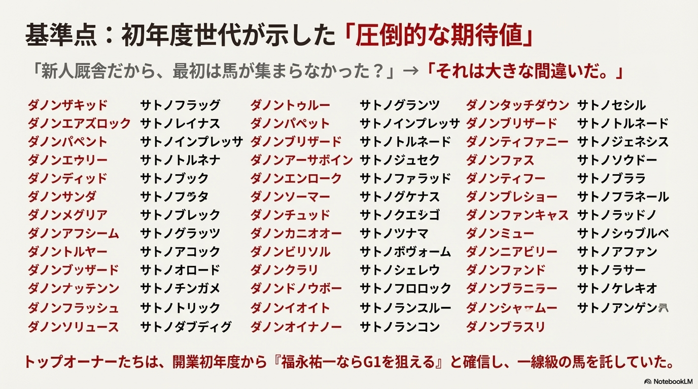 このリスト を見ただけで、福永厩舎が「騎手時代の人脈」 を活かして、どれほどの期待を背負って開業したかが分かりますよね。注目すべきは、やはり「ダノン」や「サトノ」の冠名が並んでいること 。これは、トップオーナーたちが「福永祐一なら初年度からG1を狙える」と判断し、一線級の馬を預けていた証拠です。