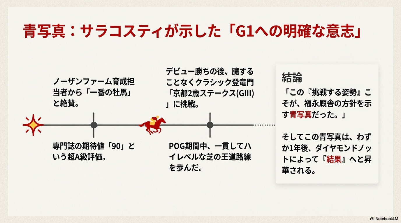 このサラコスティの軌跡は、「(ダノンなどの)有力馬主から預かった良血馬で、早期からG1戦線を意識したハイレベルなレースに挑戦させる」という、福永厩舎の明確な方針を初年度から示した「青写真」であったと言えます。