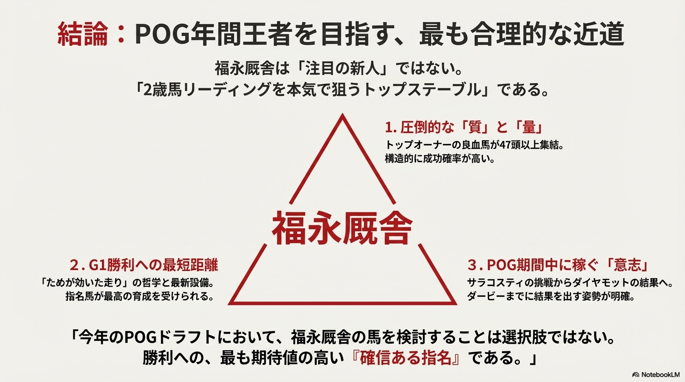 今年のPOGドラフト戦略において、福永厩舎の所属馬を最優先で検討することは、もはや「数ある選択肢の一つ」ではなく、「POGの年間チャンピオンを目指すための、最も合理的で、最も期待値の高い勝利への近道の一つ」だと、私は確信しています。