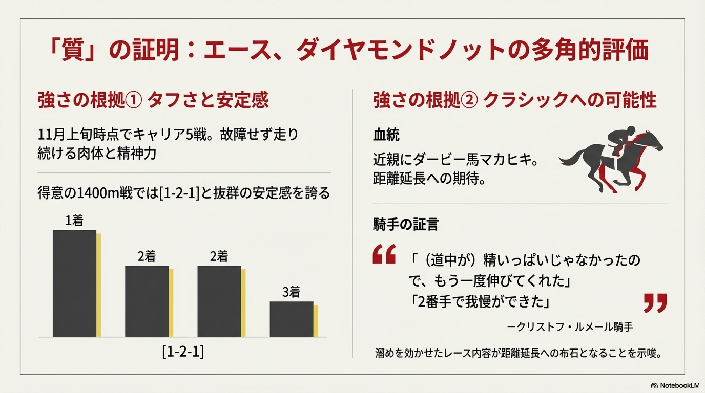 と、2歳馬離れしたレースセンス、操縦性の高さ、そして非凡な能力を称賛しています 。