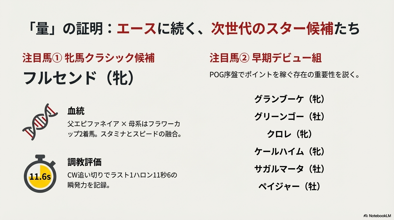 このように、牡牝ともに早期デビューが見込めそうな馬が複数控えているのが、福永厩舎の強みですね。これらの馬たちが順調にデビューを迎え、早期に勝ち上がってポイントを稼いでくれるようだと、POG戦略上、非常に大きなアドバンテージになります。ダイヤモンドノットという絶対的エースに隠れがちですが、こうした「層の厚さ」こそが福永厩舎の本当の魅力かもしれません。