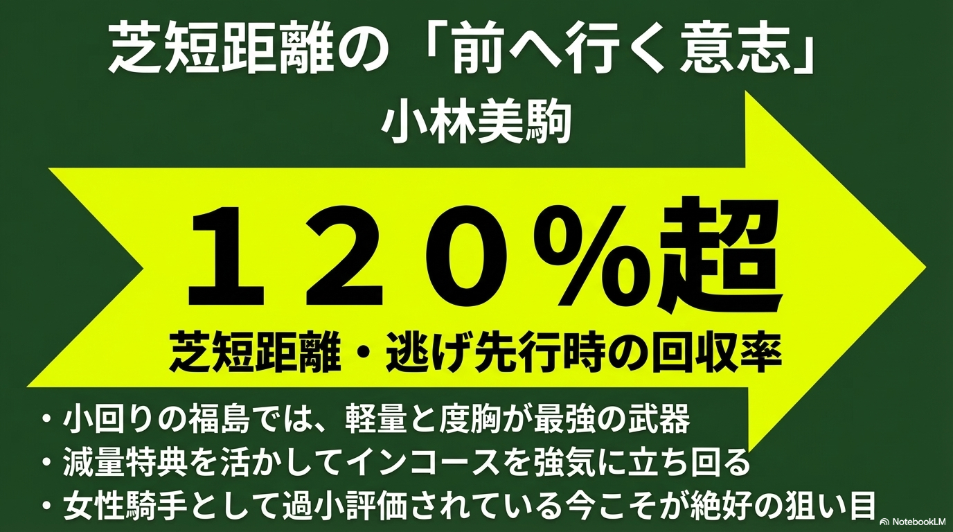 また、小林美駒騎手もダート先行馬での回収率が100%を超えており、彼女たちの積極性が福島の小回りコースに完璧にフィットしています。