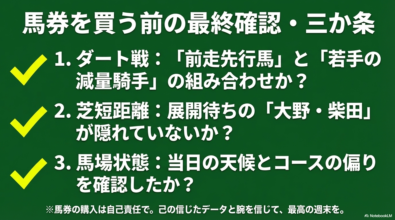 注意点として、芝1200mは先行争いが激化しすぎて「共倒れ」になる展開も年に数回あります。そんな時は、大野拓弥騎手のような「差し・追い込み」を得意とするジョッキーが、死んだふりから一気に飛んでくることがあるので、展開予測も忘れずに行いましょう。